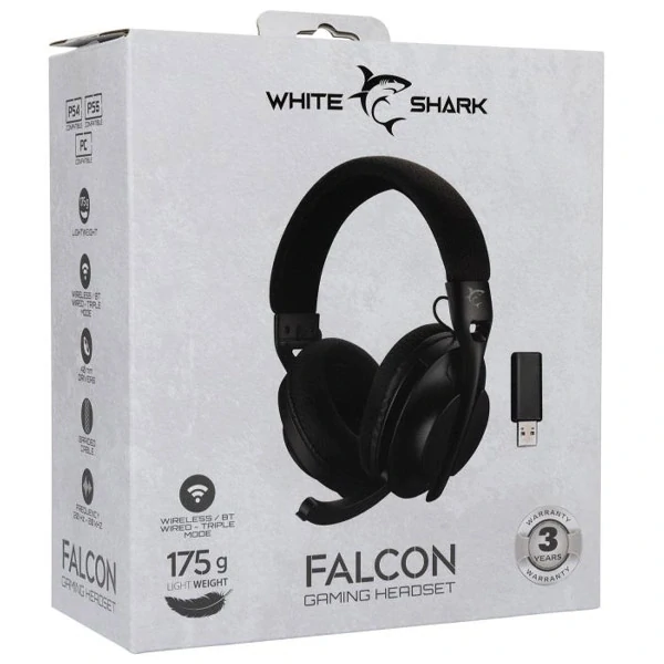 Čierny bezdrôtový headset White Shark Falcon sprostredkuje kvalitné audio so 40 mm meničmi, impedanciou 30 Ohmov, citlivosťou 121 dB a frekvenčným rozsahom 20 Hz – 20 kHz. Súčasťou je mikrofón pre jasnú a zreteľnú komunikáciu so spoluhráčmi. Zariadenie pripojíte prostredníctvom 3,5 mm jack konektora alebo bezdrôtovo vďaka technológii Bluetooth či 2,4 GHz. Napájanie zaistí kábel s dĺžkou 1 meter. Hmotnosť je 175 g. Kompatibilita: PC, PS4, PS5, XBOX, MAC.